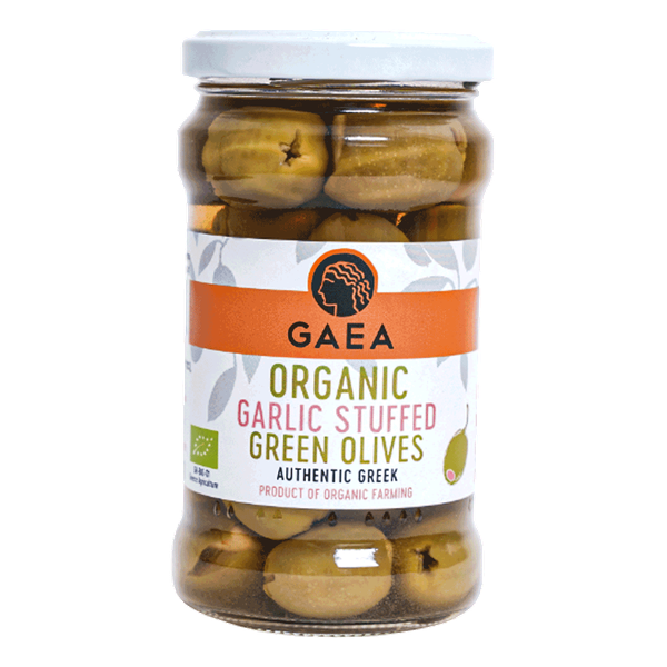 Hand-filled with whole garlic cloves, Gaea's organic green olives are a delicious meze. Enjoy them as is or add to casseroles and salads – 295 gm