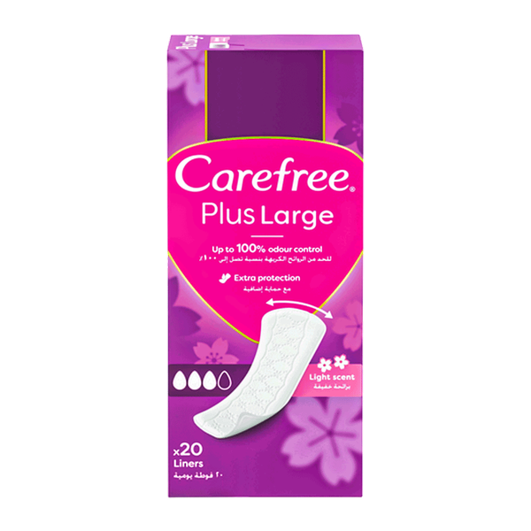 Ideal for pre- and post-period, as tampons backup, and especially for daily panty protection, Carefree Plus Large Panty Liners have you covered! With a super-absorbent core, Carefree Plus Large Panty Liners give you long-lasting protection, confidence, and freshness. Their soft-touch surface allows your most delicate skin to breathe and gives you a soft, comfortable feeling every day. Carefree Plus Large Panty Liners are dermatologically tested, have a comfortable, soft cover, a stay-in-place fit, and a secure design. While pads are suited for that time of the month, Carefree Panty Liners are your solution to feeling clean and fresh down there every other day of the month. Feel clean and fresh every day with Carefree! - 20 Pcs