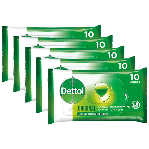 Dettol Original antibacterial wipes are not only for cleaning hands but also to protect you from illness-causing germs. These wipes are pH neutral and contain emollients to moisturize skin. It is dermatologically tested & gives out pine fragrance - 5 x 10 Wipes