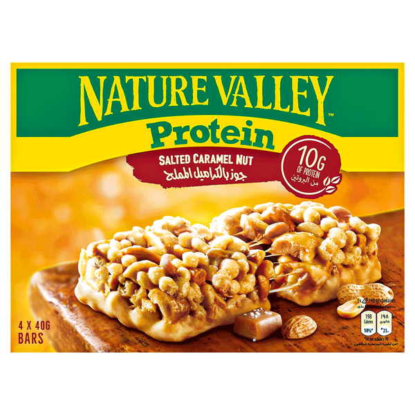 Chewy protein bar with peanuts and almonds dipped in a salted caramel flavored coating - 4 x 40 gm