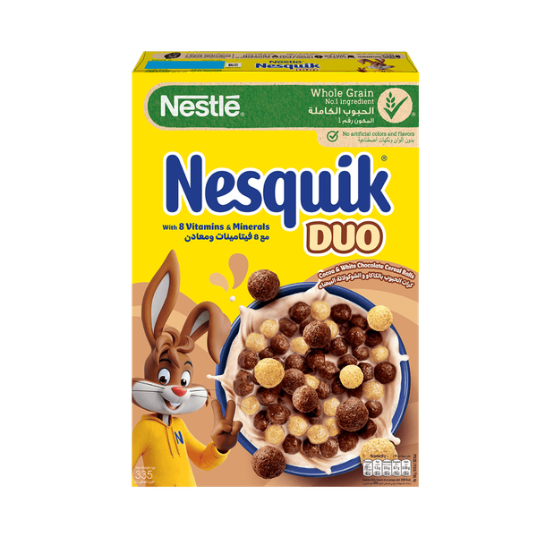 Cocoa cereal balls and marbles Nesquik flavored white chocolate and it contains Wholegrain, 7 vitamins, iron and calcium and provides your kids the essential nutrients they need for an active day - 355 gm