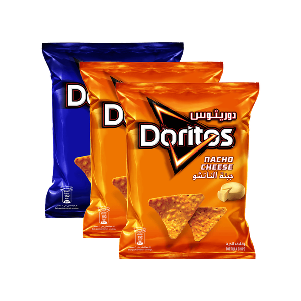 The set contains: Doritos Sweet Chili Pepper Tortilla Chips (2 x 48 gm) + Doritos Nacho Cheese Tortilla Chips (48 gm) - Set of 3