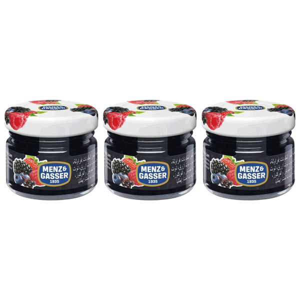 A selection of forest fruit preserves in practical portion packs, providing an easy and mess-free way to enjoy the bold flavors of mixed berries on bread, crackers, or as a topping - 3 x 28 gm