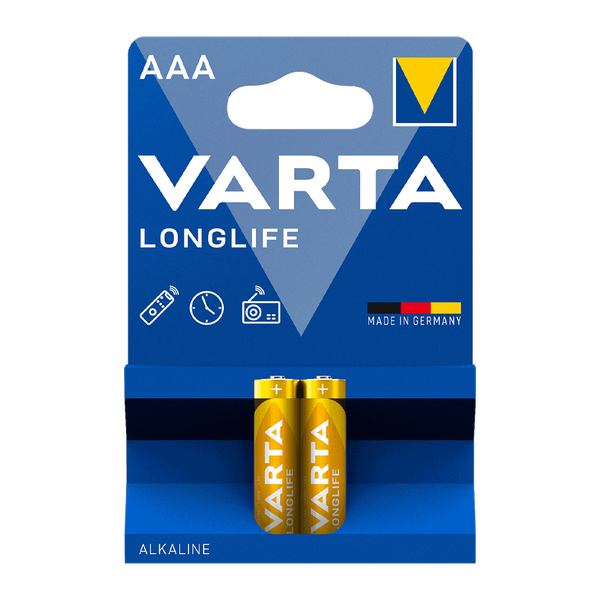 Compact pack of AAA alkaline batteries from Varta Longlife for reliable energy in smaller household gadgets - Made In Germany