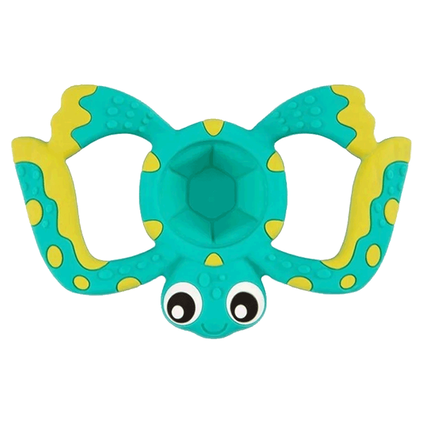 Silicone teether with pop and chew design providing safe textured relief for teething infants.
