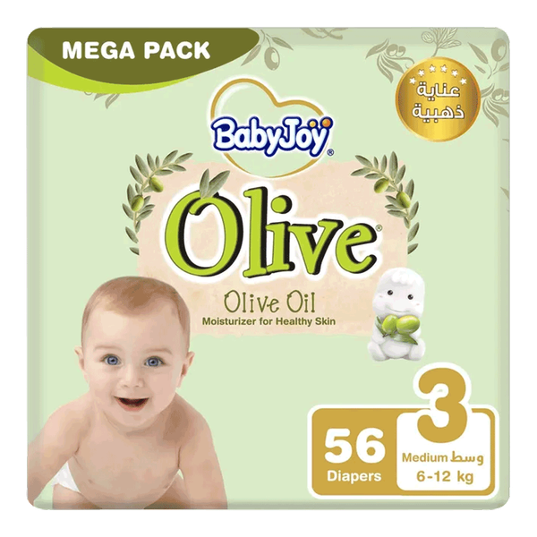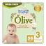 Medium diapers with olive oil formula designed for comfort long wear and skin-friendly care for active babies 6 to 12 kg.