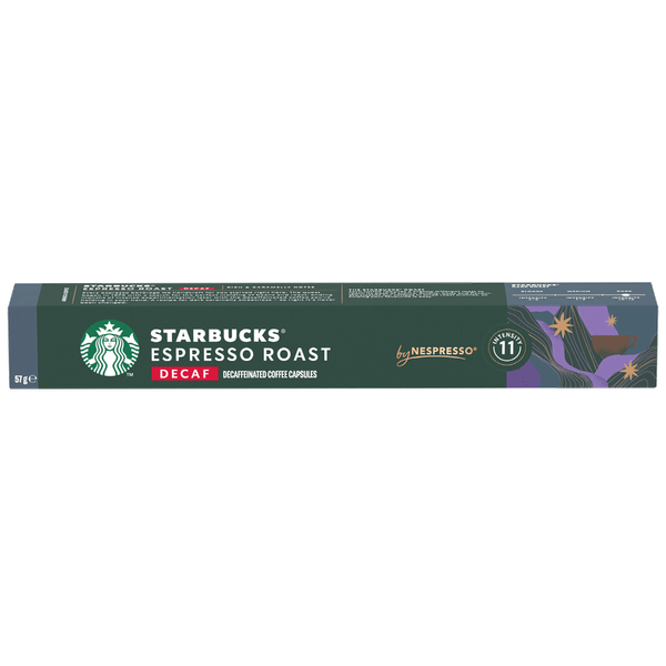 Decaf espresso roast coffee capsules by Starbucks offering full-bodied smooth flavor without the caffeine - 57 gm