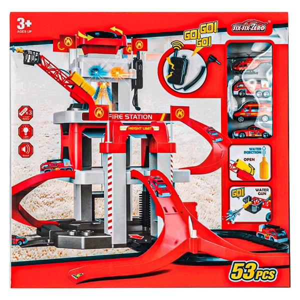 Fire headquarters parking playset with multifunctional features