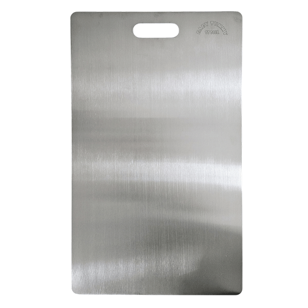 1 pc Stainless Steel Cutting Board Size: 30 x 40 cm (L) Why is the Baby Tummy Cutting Board of Higher Quality? The stainless steel used in Baby Tummy cutting boards is medical grade (Stainless Steel 316L), which is superior to the typical food-grade steel on the market. It is safer, more sterile, commonly used in medical devices, and is one of the most expensive types of stainless steel used in kitchens. Advantages: Resistant to rust, preventing the transfer of unwanted materials to food. Non-porous surface prevents bacterial growth and chemical accumulation. Does not react with acidic or alkaline foods. Easy to clean and dishwasher safe. Disadvantages: May show scratch marks from knives, which is safe. Frequent use might damage low-quality knives. Produces louder sounds during cutting compared to other materials. Edges are sharper than plastic or wood cutting boards.