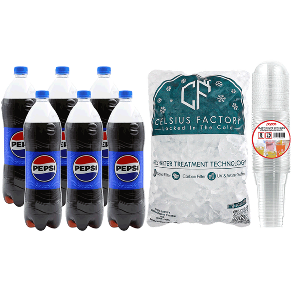 Set Includes: Pepsi - 6 x 1.25 l / Ice Cubes - 4 kg / Plastic Cups 50 x 14 oz