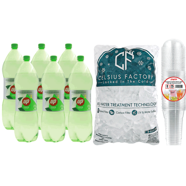 Set Includes: 7UP Zero - 6 x 1.25 l / Ice Cubes - 4 kg / Plastic Cups 50 x 14 oz
