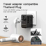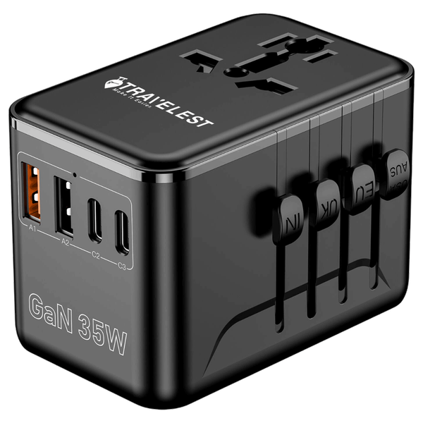 Lightweight universal travel adapter with a resettable fuse that charges multiple devices simultaneously with 3 USB-C ports, 2 USB-A, and dual AC outlets. Also supports 2500W for high-power devices and delivers 35W fast charging for phones, tablets, and laptops - 250V