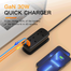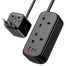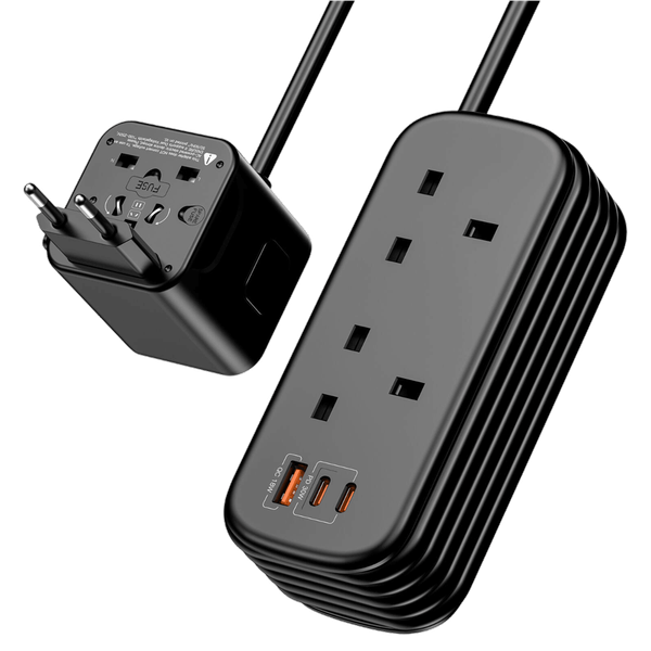 A travel power strip with two UK AC outlets, two USB-C ports, and one USB-A that delivers upto up to 30W of intelligent power that features a compact design with a retractable plug and wide spacing between sockets to avoid overcrowding - 250V