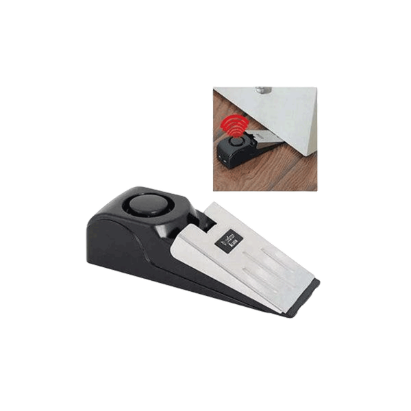 A battery operated device that works as both a door stopper when the alarm is off and a powerful intrusion alarm that features 3 adjustable sensitivity levels (low – medium – high) via a side switch and triggers a 120 dB siren when pressure is applied