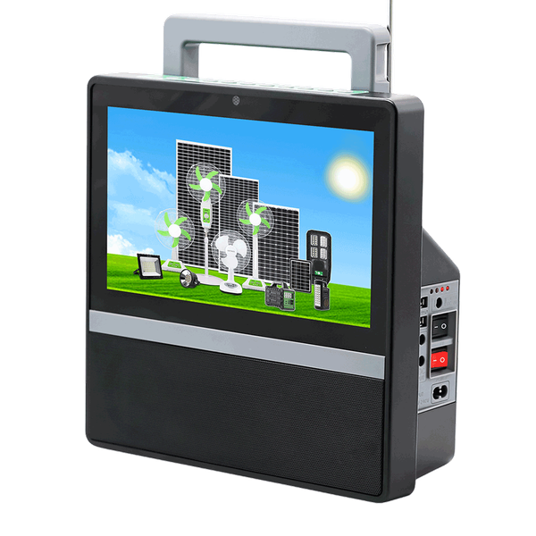 Portable solar TV and media system combines energy-efficient display, USB/SD playback, FM radio, LED lighting, and remote control for reliable power and entertainment anywhere - 10-inch screen, 20 W solar panel, rechargeable battery.