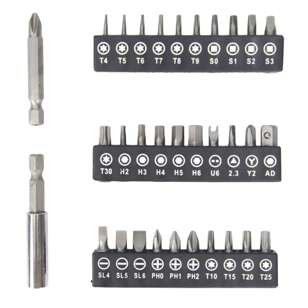 Compact and powerful cordless precision screwdriver with a 3.6V rechargeable battery, high-speed motor, and 34 interchangeable bits. Designed for electronics - 34 Interchangeable Bits