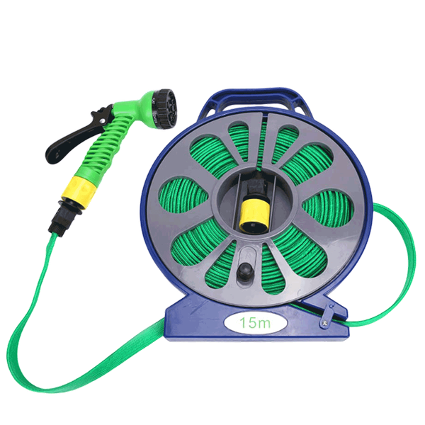 Expandable flexible garden hose extending up to 15 meters, designed with kink-resistant material and a 7-pattern spray gun. Lightweight, easy to store, and durable, it is ideal for gardening, car washing, patio cleaning, and outdoor watering tasks - 15 m
