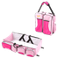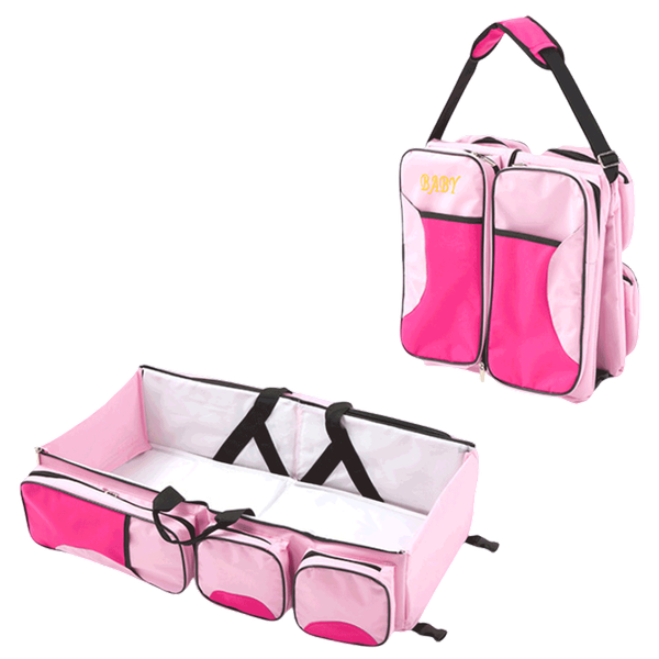 Features a multifunctional diaper bag that converts into a travel baby bed and changing station, with waterproof cushioning, multiple storage pockets, adjustable shoulder strap, durable polyester fabric, zipper closure, and lightweight foldable design - 68 x 60 x 20 cm